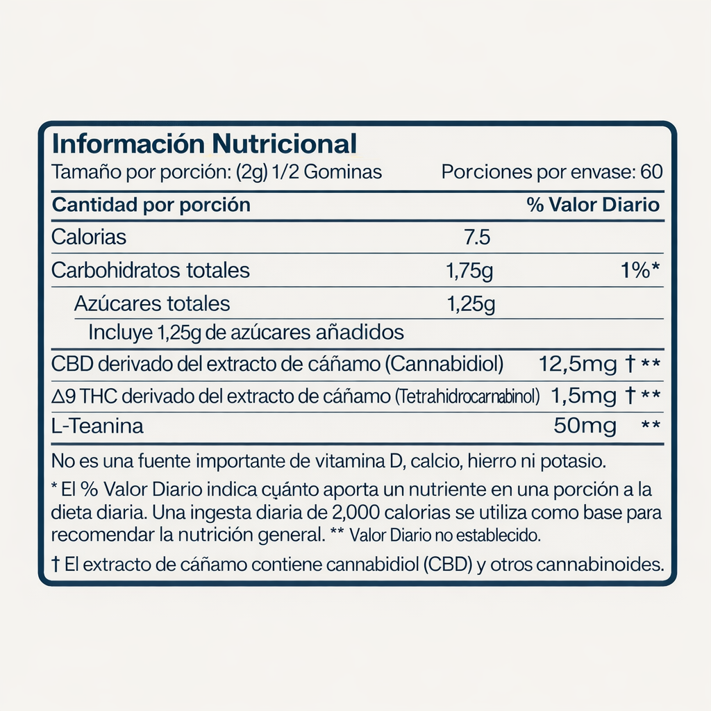 Disfrutá de media o una gomita entera durante 30 minutos cuando quieras relajarte. Mastica lentamente durante 45 segundos. Empieza con una dosis baja y auméntala gradualmente. Recuerda consultar con tu médico si estás embarazada, en período de lactancia, tienes alguna afección médica o tomas algún medicamento.